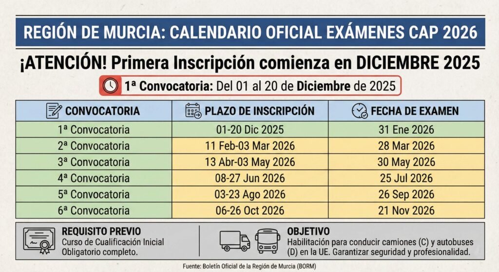 El Boletín Oficial de la Región de Murcia (BORM) ha hecho oficial el calendario de pruebas para la obtención del Certificado de Aptitud Profesional (CAP) correspondientes al año 2026. Esta convocatoria es esencial para todos aquellos profesionales que deseen habilitarse para la conducción de camiones y autobuses (permisos C y D) en el ámbito de la Unión Europea.