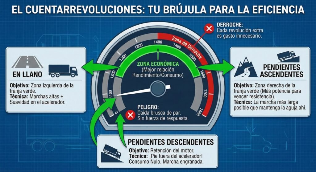El cuentarrevoluciones no es un simple medidor de las vueltas del motor; es el instrumento de control fundamental para el conductor profesional. Su correcta interpretación y utilización es lo que permite traducir la teoría de las curvas del motor en ahorro real de combustible y menor desgaste mecánico. La clave reside en la «Zona Económica» o «Zona Verde», el rango de operación indicado en el tacómetro donde se obtiene la mejor relación entre rendimiento y consumo, ya que se aprovecha el par motor máximo con un consumo específico cercano al mínimo.