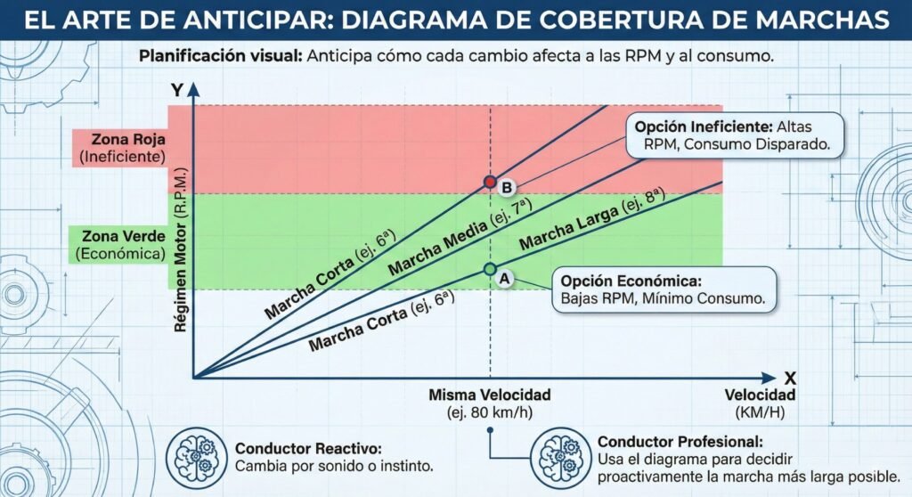 El diagrama de cobertura de marchas es una herramienta de planificación visual para el conductor. Permite entender de antemano cómo cada cambio de marcha afectará a la velocidad del vehículo y a las revoluciones del motor. Dominarlo permite tomar decisiones proactivas en lugar de reactivas, anticipándose a las necesidades de la ruta.