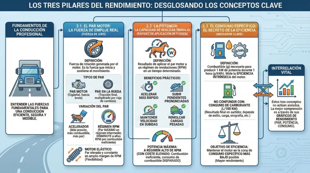 Para conducir un vehículo pesado de forma eficiente, es crucial entender las tres fuerzas fundamentales que gobiernan el comportamiento de su motor. Estas no son ideas abstractas, sino magnitudes medibles que se traducen directamente en cómo responde el camión en la carretera. A continuación, analizaremos el par motor, la potencia y el consumo específico, los tres pilares sobre los que se construye una conducción profesional.