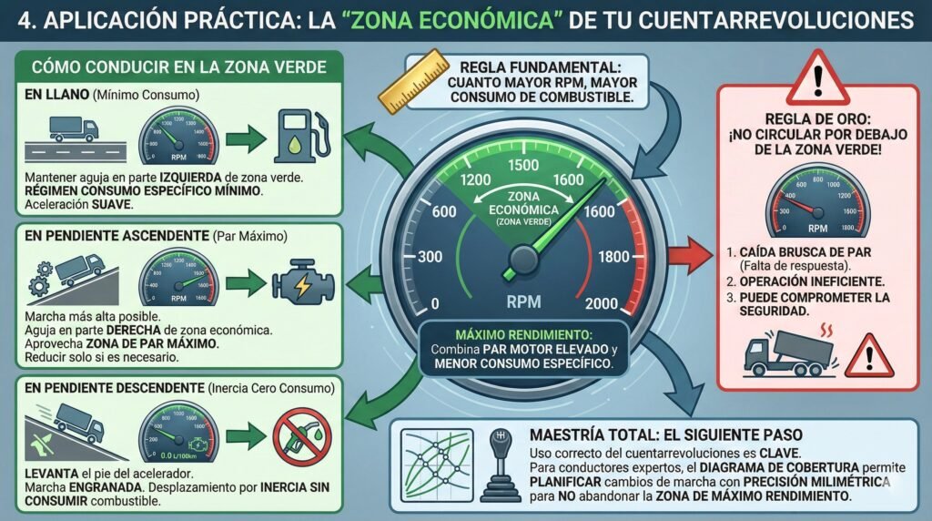 La «zona económica» o «zona verde» del cuentarrevoluciones es la traducción práctica de toda la teoría anterior al panel de instrumentos de su camión. Esta zona marca el rango de RPM donde el motor alcanza su máximo rendimiento, combinando un par motor elevado con el menor consumo específico posible. Conducir manteniendo la aguja en esta franja es el objetivo principal de la conducción eficiente. Recuerde siempre esta regla fundamental: cuanto mayor es el número de revoluciones, mayor es el consumo de combustible.